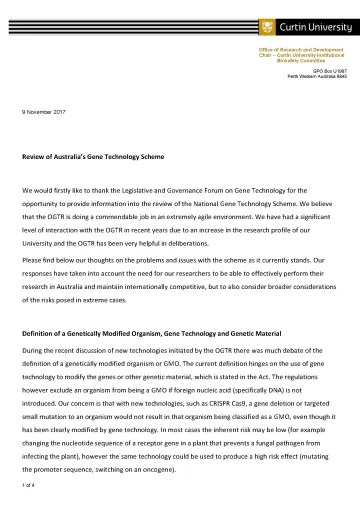 Curtin University's Institutional Biosafety Committee sent this submission for the phase 1 consultation of the third review directly to the secretariat.