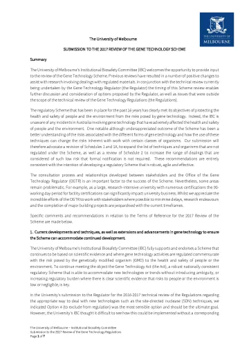 The University of Melbourne's Institutional Biosafety Committee sent this submission for the phase 1 consultation of the third review directly to the secretariat.