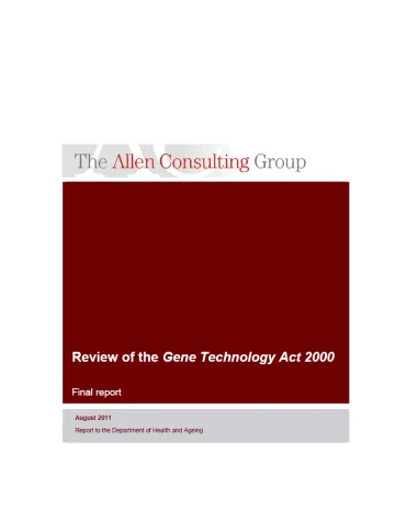 The Allen Consulting Group was engaged to review the Gene Technology Act 2000 in 2011, and report to the then Gene Technology Ministerial Council (now the Gene Technology Ministers’ Meeting). The review looked at:
